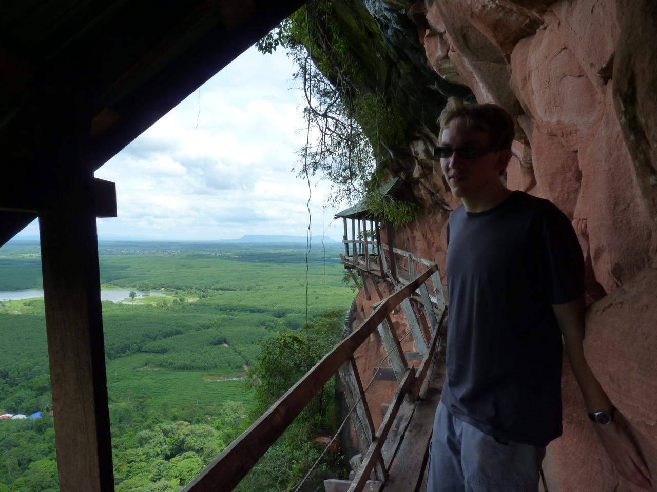 Nach 100 Höhenmetern hatte ich bereits mein Hemd total durchgeschwitzt und musste ab und zu verschnaufen. Basti sah noch recht frisch aus, wen wunderts? 32 Jahre und 35 Kilos weniger. Das macht sich natürlich bemerkbar. Also atmeten und schnauften wir uns den Holzkonstruktionen entlang immer höher. Teilweise hatte ich schon ein mulmiges Gefühl, ob die Konstruktion denn auch wirklich stabil genug sei. Der Mönch hatte aber saubere Arbeit geleistet und bis auf ein paar kleine Einbrüche im Holz ist das ganze sehr gut gezimmert. Für Leute mit Höhenangst aber absolut nicht zu empfehlen. Manchmal geht es halt 50 oder mehr Meter senkrecht hinunter und zwischen einem selbst und dem Abgrund ist nur ein schmaler Handlauf. Die letzte Ebene zu erreichen ist dann schon mit richtiger Kraxelei verbunden. Hier gibt es keine Holzstege und man muss sich an Wurzeln nach oben arbeiten. Oben angekommen noch durch ein paar niedrige Bambusbüsche kriechen und es ist geschafft.Am westlichen Ende ist dann ein großer Stein, etwas unter der eigentlich höchsten Stelle. Von hier gibt es eine herrliche Aussicht zu bewundern. Basti hat hier oben auch einen oder sogar zwei kleine Affen gesehen. Leider war ich mit dem Foto etwas zu langsam. Also nichts mit Affenbildern. Den letzten Schluck aus der Wasserflasche und wir machten uns an den Abstieg. Dieser war dann deutlich weniger schweißtreibend. Trotzdem waren wir froh, wieder den Wagen zu erreichen und unsere Wasserdepots wieder zu füllen. Bei dieser Temperatur ist die Tour schon sehr heftig. Bei Regen gehts übrigens gar nicht, denn dann sind die Bretter durch den feinen Sandsteinstaub zu schlüpfrig. Dann wäre der Aufstieg viel zu gefährlich und auch die einheimischen Pilger lassen davon ihre Finger. Wer aber einmal in diese Gegend kommt, sollte diesen Berg unbedingt besteigen. Es war absolut toll!