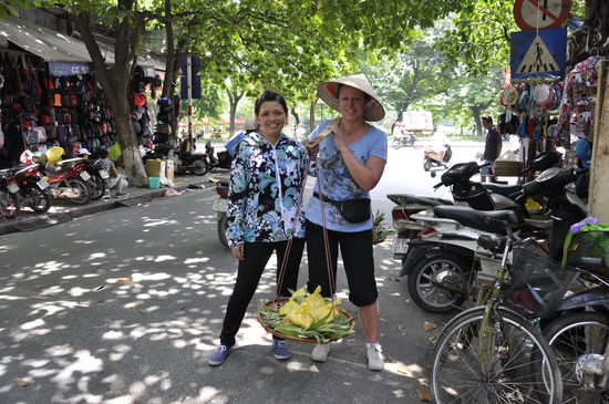 Das ist uns aber zu einfach, also raus aus dem Hotel und ab ins Getümmel der Hanoier Innenstadt. Nach 10 Minuten waren wir klatschnass. In einem Büro tauschten wir erst einmal Geld und füllten unsere Taschen mit 2,5 Millionen Dong (100€). Nun waren wir auch endlich mal Millionäre Als erstes kauften wir Karten für die Abendvorstellung des Wasserpuppentheaters. Danach spazierten wir am Hoan Kiem See entlang, wo uns Einheimische Getränke in Plastiktüten und andere Leckereien anboten. Später ließen wir uns dann doch zu einigen Sachen überreden, z.B. sind jetzt zwei schnieke Reishüte unsere neuen Begleiter.