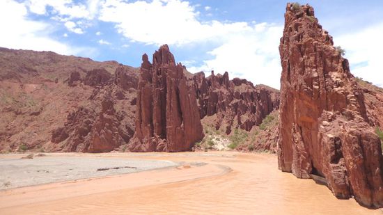 Am Abend sind wir dann auch wohlbehalten in Potosi angekommen. Die Stadt ist ca. 150'000 Einwohner gross und befindet sich am Fuss des Berges Cerro Rico. Dessen Silberreichtum hat im 17. Jahrhundert dazu geführt, dass Potosi zu einer der grössten Städte wurde. Viele Einwohner leben auch heute noch von diesen Erzvorkommen. Sian und ich haben deshalb am nächsten Tag eine Tour durch eine der Minen gebucht. Diese Tour war ziemlich eindrücklich, aber auch ernüchternd und traurig zugleich. Die durchschnittliche Lebenserwartung eines Minenarbeiters liegt bei 40 bis 45 Jahren. Wenn ein Arbeiter stirbt, zahlt die entsprechende Gesellschaft der Familie einen Betrag von rund USD 4000 Dollar aus. Auch im armen Bolivien ist das nicht gerade viel und führt dazu, dass zumindest ein Familienmitglied in die Fussstapfen des Familienvaters treten muss und somit eine Stelle als Minenarbeiter annehmen muss, um die Familie ernähren zu können. Ein Teufelskreis. Die Tour ging ca. einen halben Tag. Ganz am Anfang der Tour geht man zu einem Kiosk für die Minenarbeiter, um eine Geschenk zu kaufen. Dies beinhaltet Cocablätter, Zigaretten (spezielle, nicht industrielle, die neben Tabak auch Cocablätter, Zimt und Orangenschalen beinhalten) sowie 97%igen Alkohol. Ich weiss nicht, ob das mit dem 97%igen Alkohol stimmt. Hab schon Strohrum mit 80% probiert, das sich für mich stärker anfühlte. Wie dem auch sei, war auf jeden Fall ziemlich stark. Man konnte auch noch eine zweites Paket kaufen, in dem eine Dynamitstange, eine Zündschnur und eine weiteres brennbares Gemisch beinhaltet... das sogenannte "Teufelspaket". Pro Gruppe brauchts zumindest eines von diesen Paketen, damit der Guide eine Vorführung einer Explosion durchführen kann. Diese Vorführung sorgte bei unserer Gruppe zu einem ziemlichen Adrenalinschub. Als unser Guide das Dynamit entzündete, und wir uns die Ohren zuhaltend auf die Explosion warteten passierte...... nix! Wir mussten also schnell zur nächsten Biegung rennen. Als wir sozusagen wieder in Sicherheit waren, mussten wir abrupt anhalten, da über uns einige Sprengungen stattfanden. War eigentlich nicht weiter gefährlich, aber es hat ganz schön gerumpelt und Steine und Sand von der Decke geregnet. Um etwa zwei Uhr nachmittags war die Tour dann vorbei. In einer solchen Mine in Bolivien zu arbeiten ist sicher etwas vom anstrengendsten und gefährlichsten, was man beruflich machen kann. Da wird einem wieder bewusst, wie privilegiert wir eigentlich sind und was für ein Glück wir haben. Da Potosi selbst nicht gerade berauschend ist, haben Sian und ich entschieden, gleich am Abend einen Nachtbus nach Tupiza zu buchen, dass sich ca. eine Stunde von der argentinischen Grenze befindet.