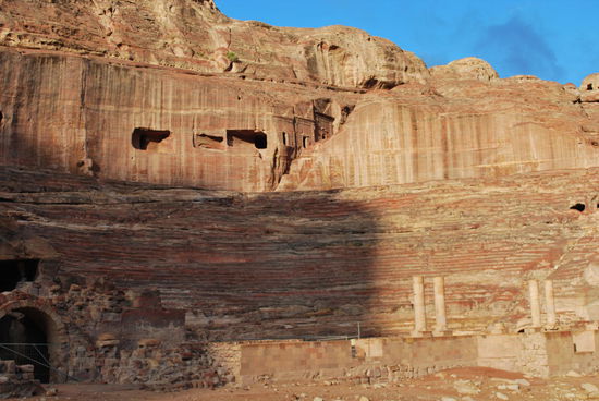 Was sieht man aber nun wirklich ? Ein Schatzhaus ist es wohl nicht, sondern ein Grabmal für einen Nabatäerkönig. 6 korinthische Säulen, ein Rundtempel und darauf eine Urne. Die weist Einschusslöcher auf, die wohl daher rühren, dass Beduinen versucht haben, die Urne herunterzuschiessen, weil sie einen Schatz darin vermutet haben. Die Bauweise ist spektakulär: Aus einem Stück in den Fels gehauen und zwar von oben nach unten. Die Überreste seitlich hochgehender Stufen lassen darauf schliessen.
