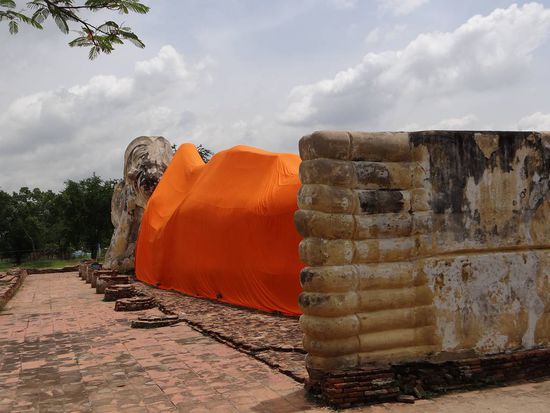 Am machten wir eine "Tuktuk-Führung". Unser Gastgeber riet uns dazu, da wir nur begrenzt Zeit hatten, weil die Rückreise nach Bangkok an diesem Tag noch anstand. So mussten wir uns bei über 30°C nicht mit dem Fahrrad abmühen und konnten noch einige Sehenswürdigkeiten bestaunen. So führte uns der Weg zu verschiedenen Tempelanlagen und zu einem großen, liegendem Buddha, welcher mit einem Tuch umhüllt war. Es ist wirklich toll sich vorzustellen wie unglaublich schön und beeindruckend diese Stadt damals gewesen sein muss... Der Tuktukfahrer und seine Frau gaben sich viel Mühe uns die Stätten zu zeigen. Beide schon in etwas höherem Alter und mit der thailändischen Freundlichkeit, die wir so lieben und schätzen. Wirklich ein süßes Paar.