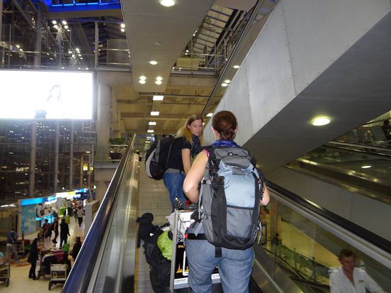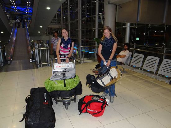 Irgendwann am frühen Morgen setzen wir in Dubai auf. Auf dem Weg durchs Terminal lief uns Anja auch schon in die Arme. Nach 3 Stunden Wartezeit ging es ins nächste Flugzeug, wo wir weiter 6,5 Stunden verbrachten. Zum Glück ging auch diese Zeit irgendwie vorbei und um 20 Uhr waren wir am Flughafen Bangkok. Wir fanden schnell ein Taxi und waren froh, dass alles irgendwie hinein passte, da wir dieses Mal eine 1,4 Meter Kitetasche dabei haben.