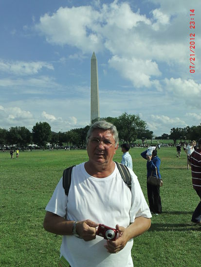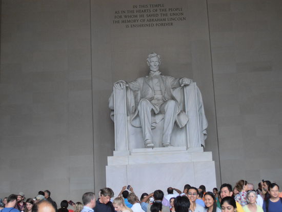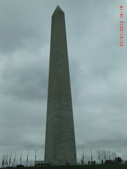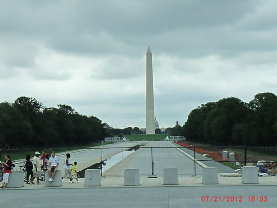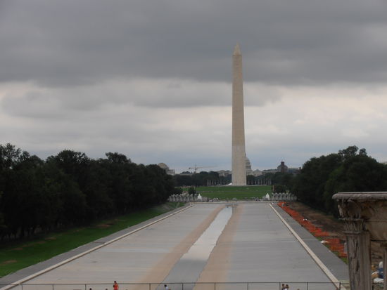 Wir haben uns für 10h mit dem Reiseführer verabredet, den wir auch pünktlich am vereinbarten Ort vorfinden. Nach einem kurzen Fußmarsch erreichen wir das Washinghton Monument. Dieser weit sichtbare Obelisk liegt genau zwischen dem Kapitol und dem Lincoln Memorial und wurde seiner Zeit aus Marmor und Sandstein zu Ehren von Georg Washinghton, dem 1. Präsidenten der Vereinigten Staaten, erbaut. Durch ein Erdbeben im Jahre 2011 wurde es einigermaßen beschädigt, und die Reparaturarbeiten halten leider immer noch an, wodurch der sogenannte "Reflekting-Pool", in dem sich der Obelisk widerspiegelt, ohne Wasser war und man auch nicht mit dem Aufzug auf die Besucher-Plattform fahren konnte.