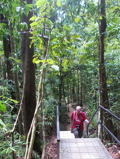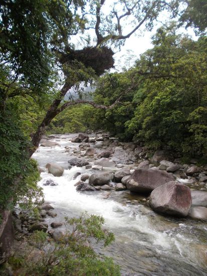 Auf unserer Weiterfahrt, haben wir auf dem Samstagsmarkt in Mareeba noch was "Frisches" gekauft, dann sind wir bis zur "Mossmann Gorge" am Rande des Daintree NP, Aboriginalland, durchgefahren. Seit ungefähr 8 Monaten ist die direkte Zufahrtsstraße ca. 2 km vor dem ehemaligen Parkplatz gesperrt, dafür ein nagelneues imposantes Visitor-Centre mit Restaurant, Shop, Training Centren (for Students) und riesigem Parkareal eröffnet worden.