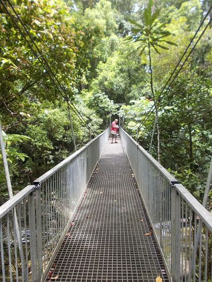 Mit einem Shuttle-Bus (5 $ H+R) wird man direkt zum Zugang zur "Gorge" gefahren. Einen halben km läuft man über einen "Boardwalk", einem über den Boden führenden Metallweg mit mehreren Zugängen zum Flußlauf, u.a. einer Stelle mit kleinem Sandstrand zum Baden. Da jetzt noch Regenzeit ist, ist der Wasserstand entsprechend hoch. Zurück führt alternativ ein Naturpfad mit Aussichtspunkten und über kleine Holzbrücken wieder zum Shuttle. Wettermässig hatten wir auch Glück, nur zweimal Nieselregen. Es ist alles so angelegt, daß auch Leute, die nicht gut zu Fuss sind, den Hauptweg unbedenklich abgehen können. Den 2,5 km langen Rainforest-Rundweg haben wir ausgelassen.