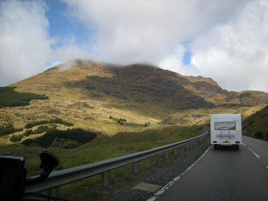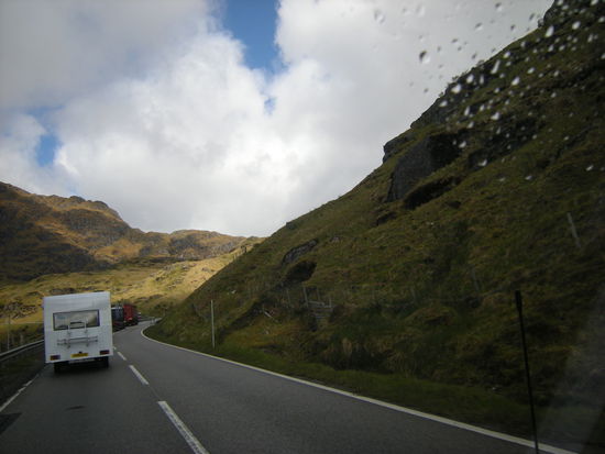 Dann erreichen wir die Highlands. Die Straße ist schmal aber immer noch so, dass zwei LKW gut aneinander vorbeikommen. Die Landschaft wird sensationell. Wir fahren wie durch die Alpen. Berge, Täler, sprudelnde Quellen, kleine Wasserfälle, Seen.