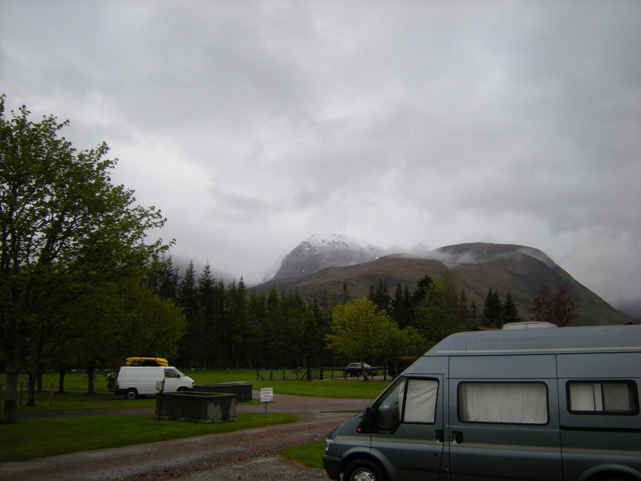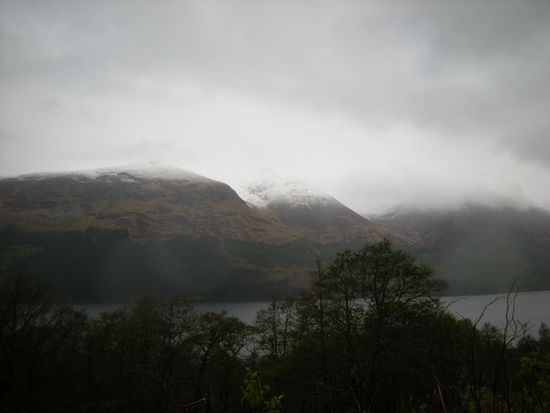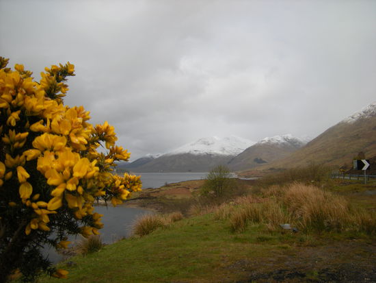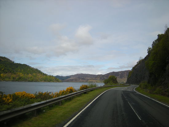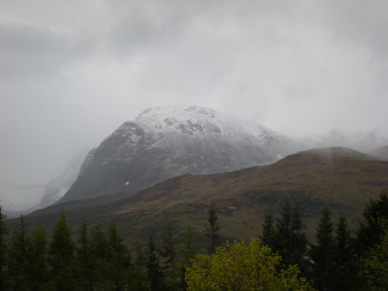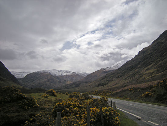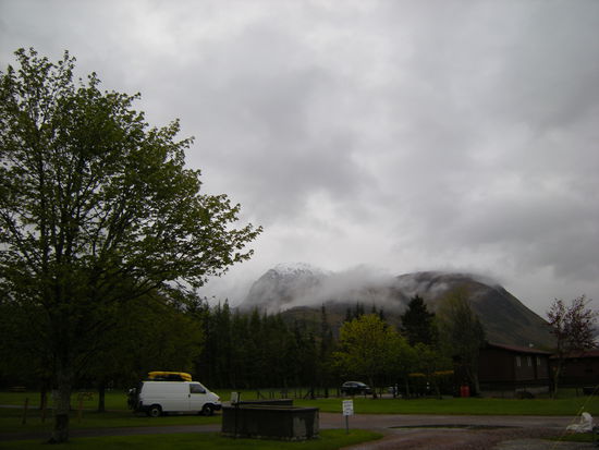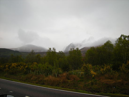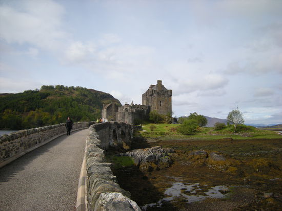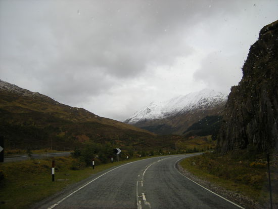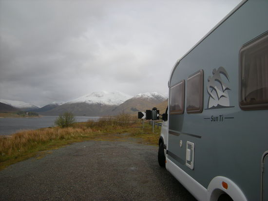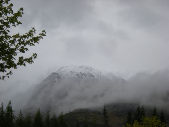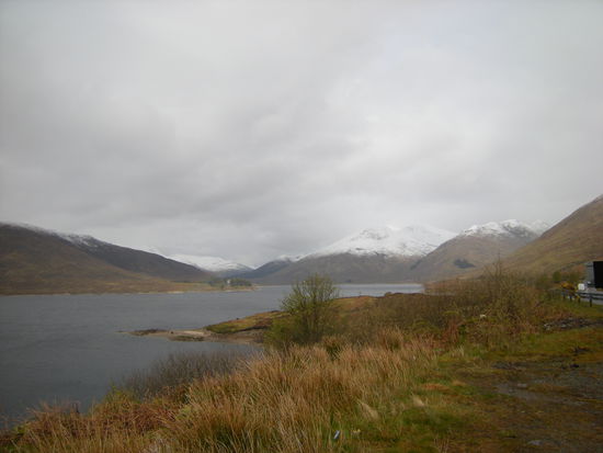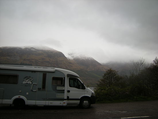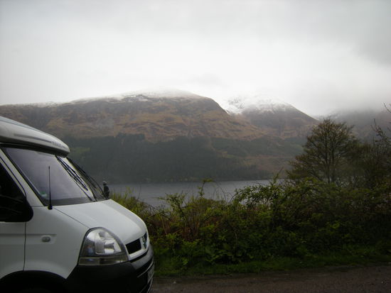 18.05. Morgens um halb sechs Ortszeit schaue ich auf den Wecker und oh Wunder... es regnet... immer noch. Das Thermometer zeigt 2 Grad und auf dem Ben Nevis liegt Schnee. Sie hatten den ganzen Winter keinen Schnee. Aber jetzt sind ja wir da. Als ich den Kopf aus dem Womo strecke, schwebt mein Atem in der eisigen Luft. Bei dieser Kälte verzichte ich dankend auf eine Dusche und aktiviere den Waschlappen. Wir setzen unsere Fahrt fort Richtung Inverness, dann biegen wir links ab und besuchen Eilean Donan Castle. Die Fahrt dorthin ist ein Märchen. Auf der einen Seite schroffe hohe Berge, deren Gipfel schneebedeckt sind, auf der anderen Seite tief eingeschnitten Seen, Flüsse, Bäche. Man kann diese vielen Eindrücke der Superlative kaum beschreiben.