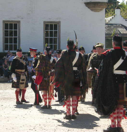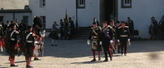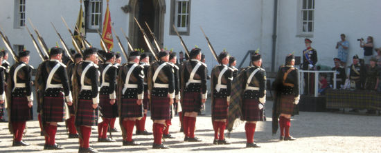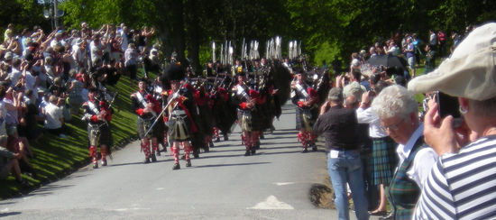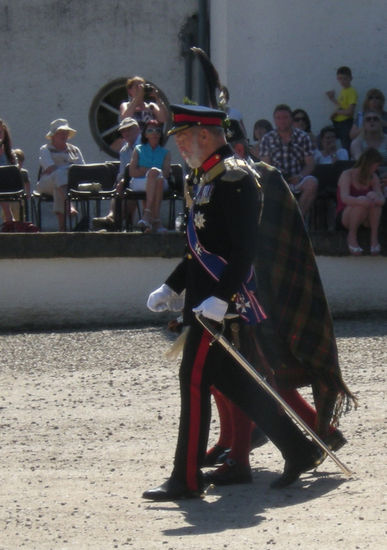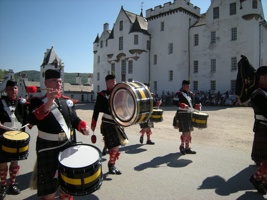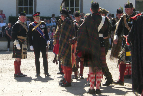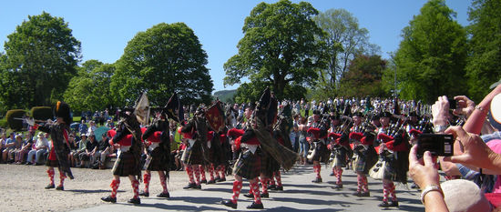 Ein super Spektakel begann. Aufmarsch der Highlander. Irgendwie passen die Schotten-Röcke hierher. Der Duke war da, erkennbar an der Adlerfeder an seiner Glangarry-Mütze, Prince Michael of Kent, ein Cousin der Queen, in einer schicken Uniform (mit Hosen), der Sohn vom Duke hat die Soldiers in Highlander-Tracht als Offizier angeführt. Als die Kanone gezündet wurde, ging ein Schrei des Erschreckens durch die Zuschauer und alle Kinder fingen an zu plärren. Jeder bläst irgendwie seine eigene Melodie. Die Schotten haben mit ihrer Dudelsackmusik sämtliche Tiere bis auf das Haggistier, das Schaf und das Moorhuhn aus Schottland vertrieben, sagt man.