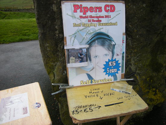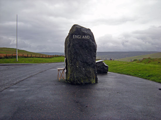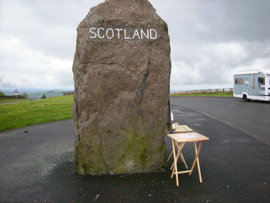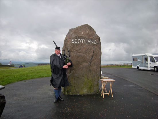 Ein ca. 3 m hoher Grenzstein, die englische und die britische Flagge, vor dem Grenz-Felsen ein Piper. Er spielt die schotttische Nationale und ein Abschiedslied. Ich sentimentales Huhn bin natürlich richtig ergriffen und schlucke schwer an dem Feuchttüchlein, das sich in meine Kehle gezwängt hat. Für 5 Pfund verkauft er eine Dudelsack-CD, mit deren Klängen wir noch lange ein wenig sinnieren.