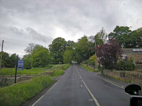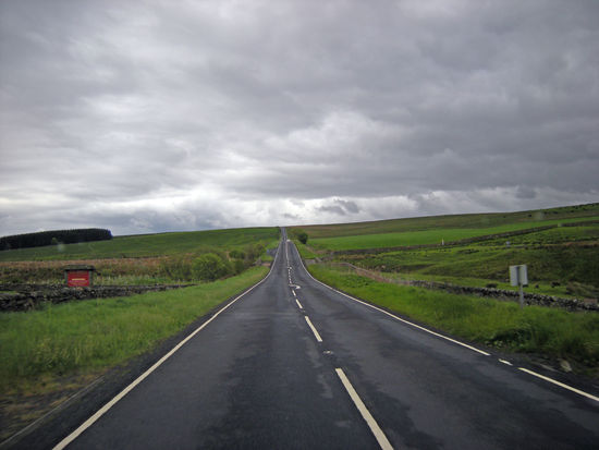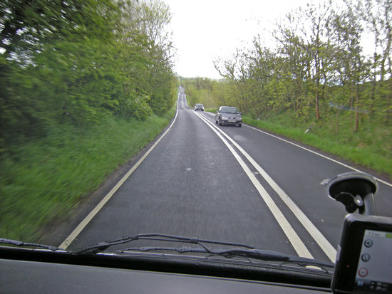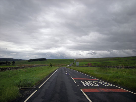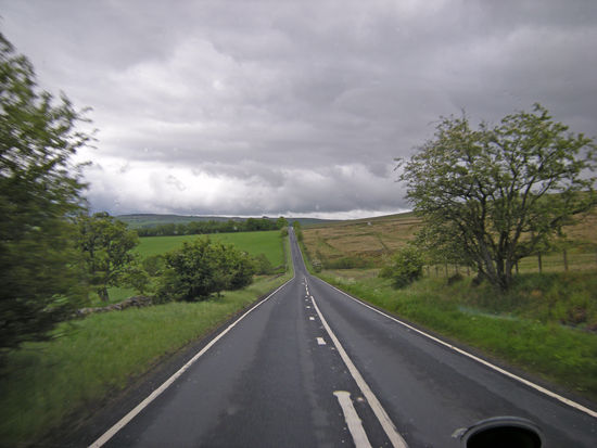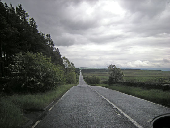 Doch hier war der Weg das Ziel. Wir fahren durch ein fantastisches Wiesental. Die Straße legt sich wie ein graues Band über Stock und Stein, über Hügel und Täler. Manches Mal hab ich das Gefühl, dass es senkrecht bergan und wieder bergab geht. Stellenweise liegen die Wellen so dicht beieinander, dass die Hecks der Fahrzeuge Spuren im Asphalt hinterlassen, wenn sie aufschlagen, weil sie zu schnell waren. Leider geht es nur ein kurzes Stück durch den Northumberland National Park. Noch einmal Schottland Highlands Feeling, dann erreichen wir die Grenze zu England.