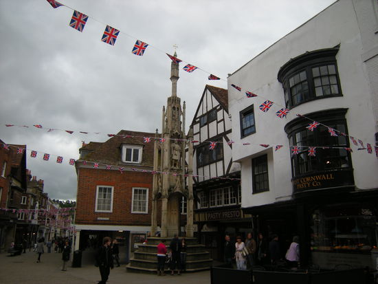 04.06. Als wir aufstehen lassen wir uns nicht träumen, was uns dieser Tag bringt. Nach dem Frühstück machen wir uns landfein um mit dem Bus nach Winchester zu fahren. Bei der Rezeption wollen wir noch einen Tag bezahlen und uns nach der Abfahrt des Busses erkundigen. Wir erhalten die Auskunft: we are full. Um unseren Stellplatz sind noch massenhaft Plätze frei, aber... sie sind ausgebucht. Nun ja, dann gehen wir eben. Wir haben keine große Hoffnung in Winchester einen Parkplatz zu bekommen, als wir in der Innenstadt herumkurven. Obwohl ja angeblich Feiertag sind alle Geschäfte geöffnet und der Verkehr ist nach wie vor ungeheuerlich. Wider Erwarten finden wir doch einen Parkplatz auf dem zwar Womos nicht erlaubt sind, aber es noch ausreichend Platz für uns hat. Also Besichtigung der zauberhaften alten Innenstadt und der Kathedrale. Die Kathedrale von Winchester ist die zweitlängste Kathedrale in Europa und wurde 1079 errichtet. Ihre einzigartige Bauweise verbindet die Architekturstile vom 11. bis zum 16. Jahrhundert. Im Inneren wurden viele Bischöfe von Winchester begraben, u. a. William von Wykeham. Auch die Gräber von Königen, wie Egbert von Wessex, Canute und William Rufus findet man dort neben bekannten Personen wie Jane Austen.
