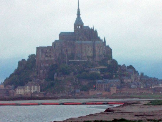 Nach dem Frühstück entsorgen wir noch, füllen den Wassertank und fahren diesmal über die Autobahn Richtung Le Mont Saint Michel. Dafür zahlen wir 5,10 €. Es regnet in Strömen und es ist diesig. Das werden mal wieder keine Bilder. Unser Navi geht völlig in die Knie als wir in die Nähe des Mont kommen, denn hier ist alles neu. Riesige Parkplätze wurden angelegt und die Straßenführung hat sich total geändert. Parkwächter stehen bereit und schicken uns zu Parkplatz 8. Speziell für Womos. Eine Schranke, Karte ziehen. Auf dem Weg Richtung Abtei, lese ich am Kartenautomat 12,50 € Tagespreis und 25 € incl. Nacht. Ups. Wir marschieren die paar Kilometer bis zum Meer, machen Fotos, die natürlich eher schwarz/weiß und verschwommen werden. Auf die Besichtigung der Benediktiner-Abtei verzichten wir diesmal. Nach dem Mittagessen werden wir tatsächlich für die zwei Stunden Standzeit 12,50 € los. Und das geht auch nur mit der Visa-Karte.
