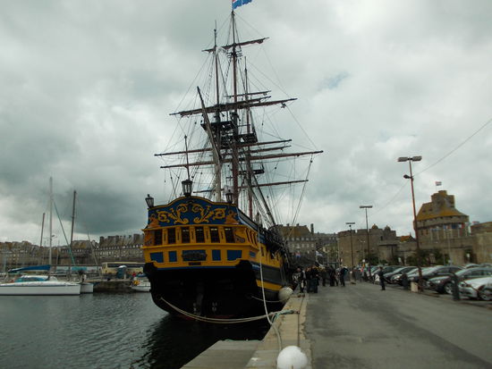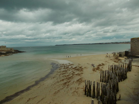 Wir fahren weiter nach St. Malo. Auch diesmal wieder über die Autobahn, doch es will niemand Geld von uns. Ich gebe den Womo-Stellplatz ins Navi ein, doch auch hier sind einige neue Straßen und Kreisel und unser Navi schickt uns einige Male im Kreis herum. Dann fahren wir einfach Richtung Hafen, suchen uns einen Parkplatz. Wir stehen mehr schlecht als recht am Straßenrand, denn auch hier sind die Parkplätze mit Balken auf 2 m Höhe gesperrt für größere Fahrzeuge. Trotzdem besichtigen wir Stadt, Hafen und Befestigungsanlagen. Es hat Ebbe und die vielen Unterwasserfelsen sind sichtbar, die die vorgelagerten Festungen und Verteidigungsanlagen zusätzlich schützen. Ein richtiges Korsarennest und eine ziemlich freudlose Kirche, die nach Moder, Feuchtigkeit und grauer Vorzeit riecht.
