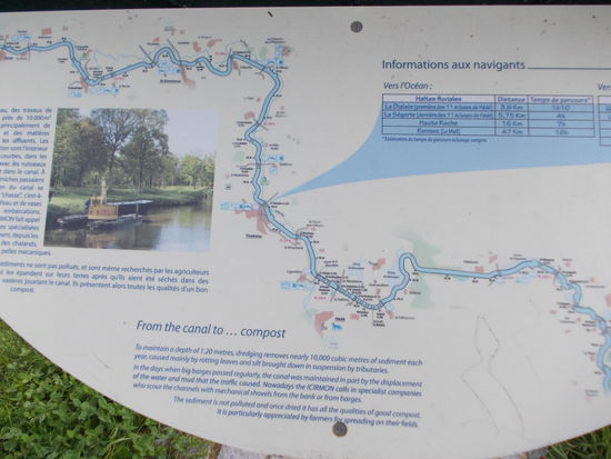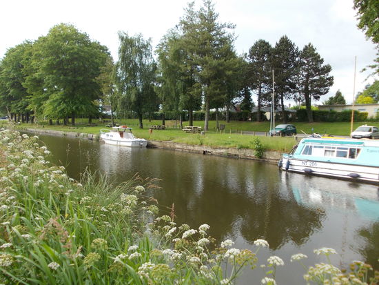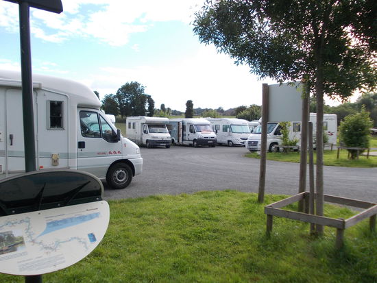 Jetzt stellen wir die Nase endgültig Richtung Innenland. Irgendwann müssen wir ja mal an die Heimfahrt denken. Eigentlich wollten wir bis Rennes weiter, doch schon bald entdecken wir ein Camping-Schild an der Autobahn und Manfred fährt ab Richtung Tinténiac, ein winziges Nest von dem noch niemand je etwas gehört hat, und findet einen prima, kostenlosen Stellplatz an der l'Ille, mit Entsorgungsmöglichkeit und Wasseranschluss. Die Ille ist teilweise schiffbar für Sportboote, hat aber keinen Anschluss an das andere französische Kanalnetz, weshalb wir sie mit dem Boot auch noch nie befahren haben. Bis spät abends kommen Womos und versuchen hier unter zu kommen. Die letzten stellen sich einfach kreuz und quer vor die bereits parkenden. Nachts will eh keiner weg. Beim Entsorgen plaudern wir noch ein wenig mehr schlecht als recht mit einem Franzosen und ziehen dann los, nur um 5 Minuten später in einen Super-U-Parkplatz einzubiegen und einzukaufen.