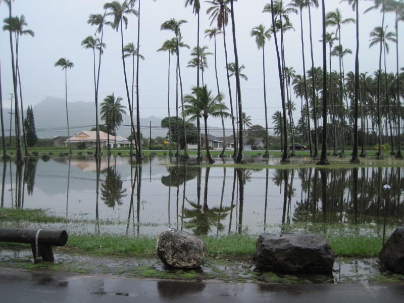 Weiter ging es dann in Richtung Kapaa. Die Zufahrt zum Hotel war an diesem Tag recht abenteuerlich. Zwischen dem Kuhio Highway und dem Coconut Marketplace vor dem Hotel hatte sich ein mindestens 30 cm tiefer großer See gebildet. Mit einem Jeep ist das kein Problem (dachte ich mir). Dann habe ich in der Betriebsanleitung mal nachgesehen, da stehen 50 cm.