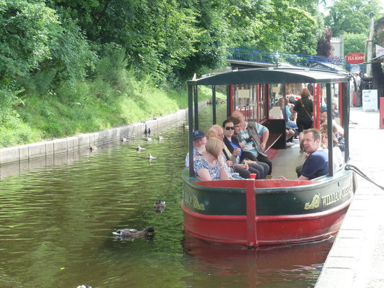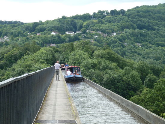 Der Ort Llangollen liegt am River Dee - hat mit einer Museumseisenbahn und dem Llangollen-Kanal, auf dem man Hausboote mieten oder auch auf von Pferden gezogenen Schiffen durch die Landschaft gleiten kann, einige touristische Attraktionen zu bieten. Entsprechend überlaufen ist er inzwischen. Wir machen trotzdem einen Stop.