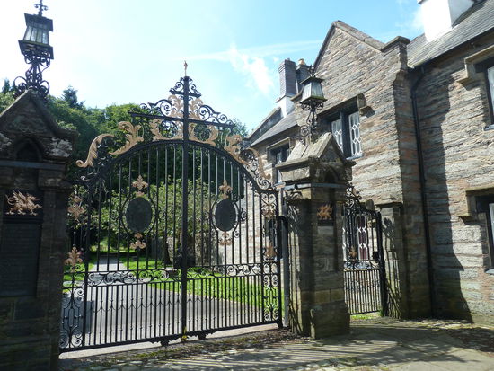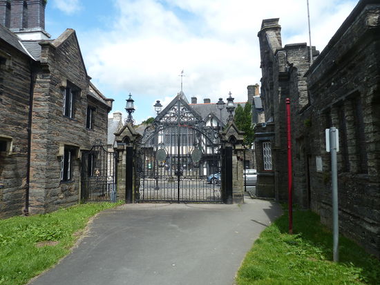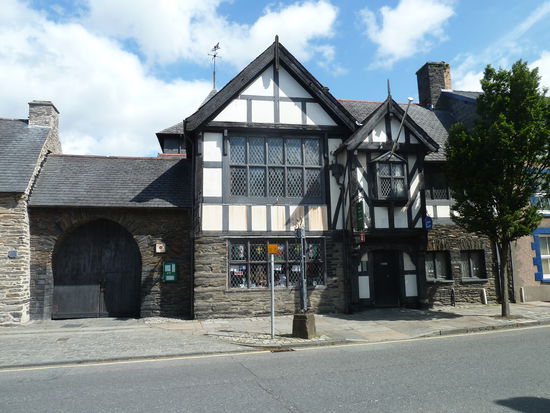 When you reach the road, turn LEFT ' and walk along the road to a cattlegrid to return to the start, first passing the Old Court House on the left- an inscription on the building reads -3628 Owen Pugh io uxor', with the date marking the rebuilding of an earlier structure. 'Uxor' is Latin and means wife, but apparently there is no established translation for 'io'. This was once the court house for the Lordship of Cyfeiliog - and the Old Parliament House on the right - 2004 was the six-hundred-years anniversary of the crowning of Owain Glyndwr as Prince of Wales in Machynlleth, and it was near here that he held a parliament. Although having been rebuilt, the building on the left is a fine example of a late medieval Welsh town house, one of only eight Grade I listed buildings in Montgomeryshire. It contains a GIyndwr exhibition. The Institute, on the right, was built in 1911, although it appears to be much older. The toll stones which once stood in Pentrerhedyn Street and Doll Street are kept upstairs.