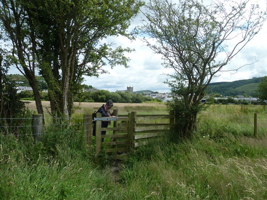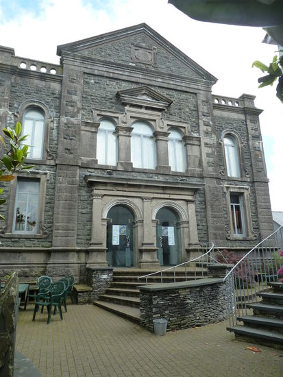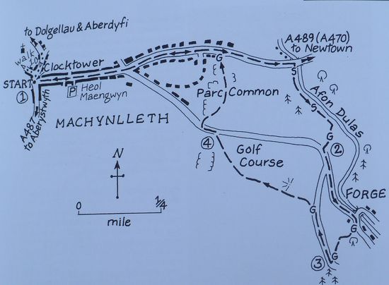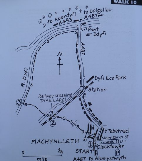 From the Clock Tawer walk towards the Station and take the first LEFT by Royal House, to walk down the Garsiwn. Royal House recently underwent extensive renovation. It is believed to be the oldest surviving building in Machynlleth, although the front was altered in the 19th-century to accommodate a shop. David Cam, who attempted to assassinate Owain Glyndwr, was imprisoned here between 1404-12, and tradition has it that Charles I stayed here in 1643. An ancient well has been discovered. Garsiwn translates as 'Garrison', and recalls a time when soldiers assembled here around 1570 before going to Ireland. The Carsiwn Well would have constituted an important water supply for the men and their horses. The Corris Tramway, which connected the Corris Steam Railway with the port of Derwenlas, once ran across Garsiwn Square, It was first used in 1859, the carriages being horse drawn. Turn RIGHT at the bottom then veer left to walk between houses in the far left-hand corner of a 'triangle'. Walk down a narrow path between houses (ignore the field gate on the left) to go through a metal kissing-gate and enter a field. Now walk with the fence to your left. cross a stile and coiitinu« with a ditch to your left to reach a rough bridge and a stile. Cross these and continue to another stile ahead - and don't forget to turn around for an unsual view of the Machynlleth skylionee. It can be quite muddy here during wet weather Cross this and maintain your direction towards the railway and a prominent crossing sign. Cross a stile and climb up to the tin«, then STOP. LOOK AND LISTEN. Only when you are certain it is safe to to so. cross the line and walk down to the stile opposite» and cross this Follow the path through *apatch of rough ground and cross a stile to join a track. Now cross a ladder stile opposite to walk on a concassionary path between field boundaries on Tir Gofal land, where access with a dog may be restricted during lambing time. When you reach an open field veer LEFT to reach another ladder stils. Cross this and carry on ahead to reach the Afan Dyfi. Turn RIGHT and walk with the river to your left. Cross a stile and continue to eventually reach another stile, which you cross. Carry on to reach a stile beside Pont ar Ddyfi. Cross this and turn RIGHT to walk along the dedicated roadsids track towards Machynlleth. There are good views up and down the Dyß Valley, and you will also see the interesting buildings of the Dyfi Eco Park. When the track ends just before the railway bridge and station carefully cross the road and negotiate your way to the raised pavement under the bridge. Continue back towards the Clock Tower, passing the War Memorial and the Tabernacl on your left. Tabernacl opened in 1986 as a centre for the performing arts, the Tabernacl hosts concerts throughout the year. and a renowned festival in late August. The beautiful auditorium holds 400 people seated on pitch pine pews, where they, and the performers, revel in the buiilding's perfect acoustics. The Museum of Modeen Art Wales has six elegant exhibition spaces, hosting the Tabernacl Collection of Modern Welsh Art and a series of temporary exhibitions. There are workshops,and an annual art competition.