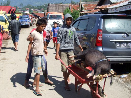 Fischmärkte, Gemüsemärkte kennt man zur Genüge. Ein Markt extra für Büffel & Schweine. Erstaunlich, absolut erstaunlich. Der Markt befindet sich auf der Straße von Rantepao nach Palopo und man kann dazu nur eins sagen. Der Büffelmarkt passt in das Torajaland.