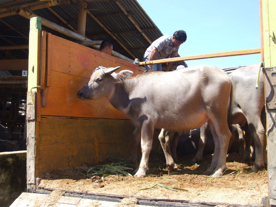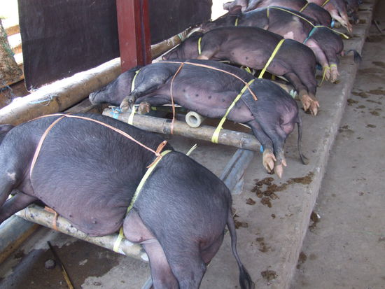 Hier können sich Einheimische mit Vieh eindecken. Die Schweine sind dazu praktisch auf Bambus gebunden. Schweine die sich mit ihrer Lage abgefunden haben, quiecken nicht mehr. Büffel sind kostbare Ware.