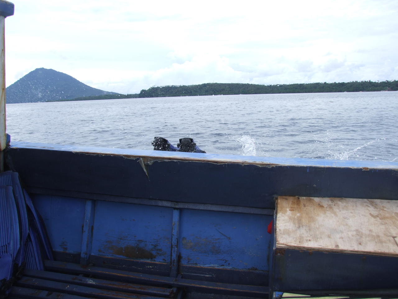 Endlich fertig angezogen, saß ich neben meinem Dive Master auf der Kante des Holztauchbootes und wartete auf den nächsten Befehl. Tausenmal gesehen bei anderen Tauchern, einfach auf die Tauchkannte setzen und rückwärts ins Meer springen. Wir befanden uns auf offenen Wasser, wohlbemerkt, also kein kuschliger Swimming Pool. Sieht ja einfach aus, wenn man von Weitem zusieht. Aber selber mit dem ganzen Tauchkram an, rückwärts in Wasser springen ?
