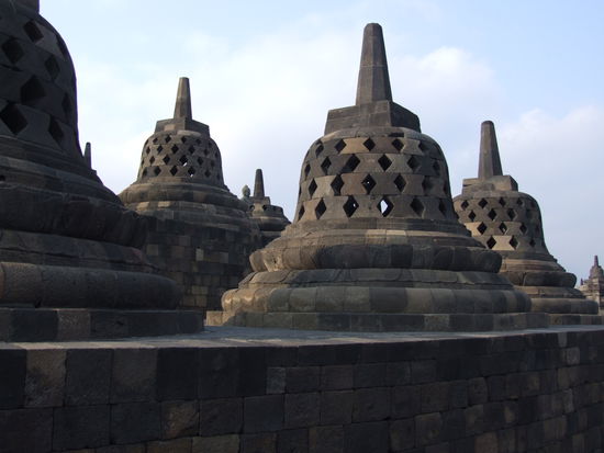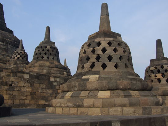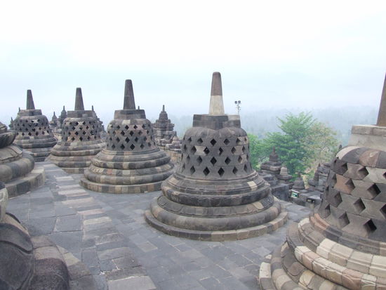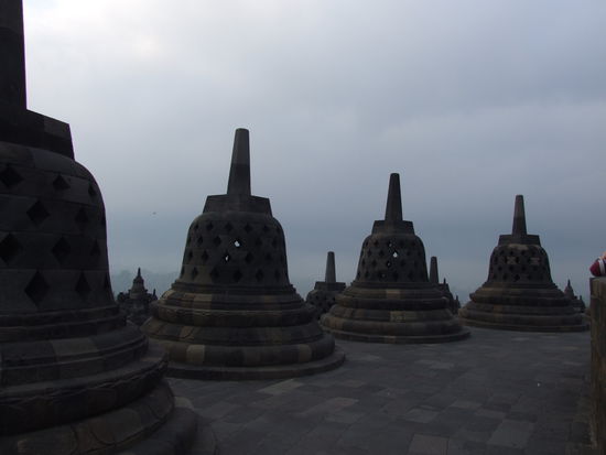 Meine Entdeckernatur war gefordert und ich war absolut über alle Maßen begeistert. Im Morgengrauen früh am Morgen um 6 Uhr kamen wir am Borobudur an und wurden von den Indonesiern in Sarongs gewickelt. Wohlweislich hatte ich trotz tropischen Klimas lange Hosen angezogen. Wir wanderten in die Sarongs gewickelt entlang zum Tempel im Morgengrauen fast allein am Borobudur. Stupa`s über Stupa`s über Stupa`s, gab es zu sehen, die kreisförmig angeordnet sind, auf den oberen Eebenen.