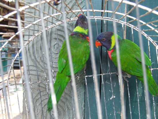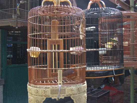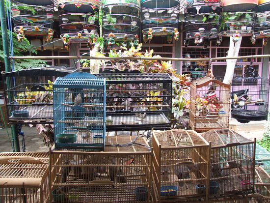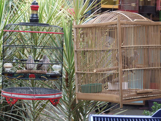 Wundersam ist das richtige Wort. Käfige mit Vögeln aller Art und jeder Farbe. Wellensittiche, und andere tropische Vögel in allen möglichen Größen sind im Angebot. In bunten Bambuskäfigen werden Kakadus, Loris, Sittiche, Prachtfinken, andere Ziervögel, Eulen, Fledermäuse, Echsen, usw. angeboten. Auch das passende Futter wird verkauft. Verschiedene Sämereien produzieren Insekten und deren Larven.