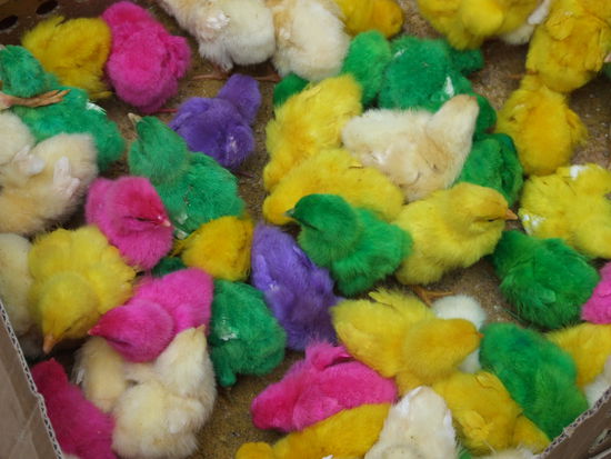Solche bunten Küken in einem Karton. Der Fachmann staunt und der Laie wundert sich. Wie kommt das? Antworten dazu nehme ich gerne entgegen. Wir mutmaßten, daß Farbe in die Eier gespritzt worden sein muß. Auf jeden Fall waren die Küken knallbunt.