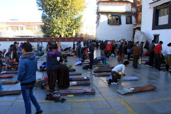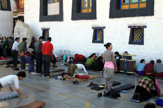 Vom Hotel geht es durch eine Fußgängerzone in der langsam das Leben erwacht und die Verkaufsstände aufgebaut werden. Wir befinden uns im "Tibeterviertel". Das ist leider der ganze Rest, der vom ursprünglichen Lhasa übrig geblieben ist - und das ist reichlich wenig. Die wenigen Straßen werden durch das "moderne, chinesische" Lhasa komplett erdrückt. Dazu noch ist hier die chinesiche Polizei allgegenwärtig. Alle 50 Meter befindet sich ein "Polizeiposten", also stehen 4-6 Polizisten herum und passen auf. Als wir auf dem Vorplatz des Phokang ankommen werden wir nachdrücklich ermahnt, dass hier fotografieren verboten ist - zu viele Polizisten und Militärs der Chinesen. Als wir kurz stehen bleiben, werden wir sofort zum weitergehen aufgefordert. Erst am Ende des Platzes, unmittel vor dem Tempel selbst dürfen wir stehen bleiben und auch fotografieren, wie sich die gläubigen Tibeter immer wieder auf ihre Matten niederwerfen.