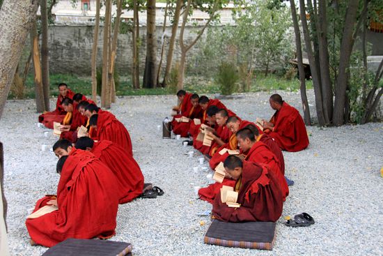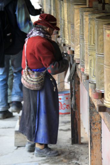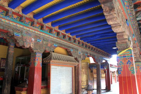Die zweite Sehenswürdigkeit in Tsetang ist das Kloster Tandruk. Die Besonderheit hier ist ein außerordentlich kostbares Perlen-Thangka. Ehrlich gesagt waren wir alle mehr oder weniger enttäuscht. Zum einen hängt das Thangka in einer Kammer, die eher an eine Gerümpelkammer erinnert und den Weg dort hin hätte ich gar nicht gefunden, weil die Räume davor fü rmich eher wie Wohnräume für die Mönche gewirkt haben. Das Thangka selbst wirkte auf mich zumindest auch eher unscheinbar. Ich habe mir da erst einmal klar machen müssen, dass es mich auch bei der Mona Lisa, dem Männeken Piss oder den Bremer Stadtmusikanten ähnlich gegangen ist.
