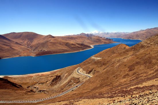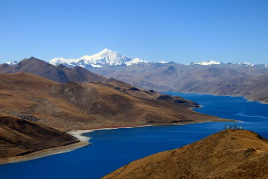 Erstes Highlight wird der Yamdrok Tso (See des Himmels) in fast 4.500 Metern Höhe. Die Farben sind einfach unglaublich. Der See ist immerhin 30-40 Meter tief und über 600 Quadratkilometer groß.