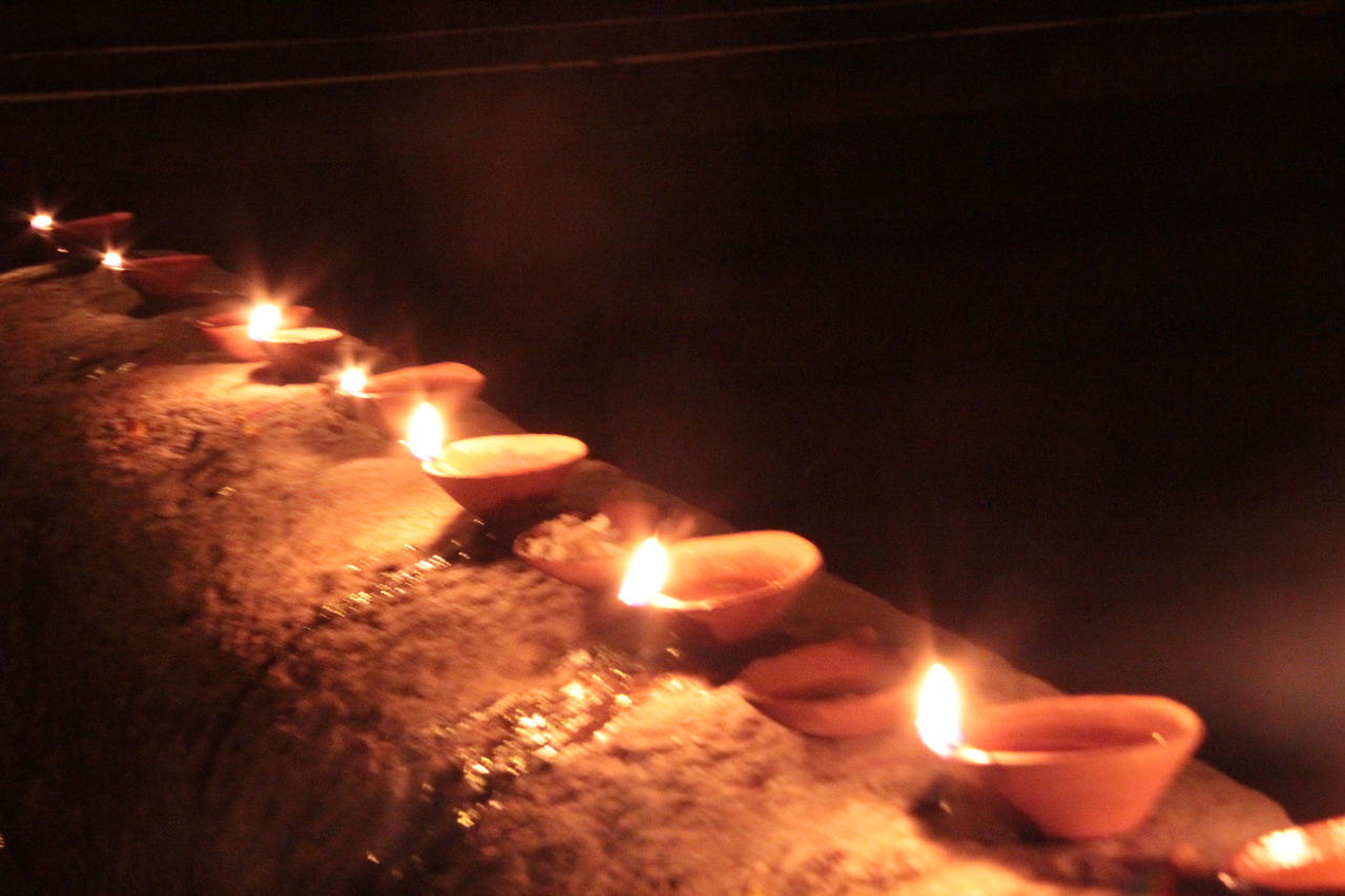 So schlendern wir weiter und treffen unterwegs Tim, Kim und noch ein paar Mädchen aus Korea, Japan und HongKong. Gemeinsam gehen wir zum "Ganga-seva-niani"- fest und nehmen an der Zeremonie teil, es ist auch gleichzeitig das Lichterfest in Varanassi. Anschließend entführen sie uns noch in eine der vielen Gassen zum Essen. Ich hab wie immer einen Mordshunger, doch dem Mausbiber ist gar nicht nach essen. Ihm ist die indische Würze auf den Magen geschlagen. Ein netter Kellner verordnet ihm Spezialkost, Reis mit Gemüse, mild gewürzt...siehe da, es hat gewirkt. Auf dem Weg zurück ins Hostel wird überall mit Böllern geschossen und die Menschen wünschen uns ein herzliches"Happy Valley". Auf dem Ganges schwimmen tausende von Lichtern in Babanenblattschalen, die vorher von den Frauen mit bunten Blüten geschmückt wurden, ein märchenhafter Anblick...