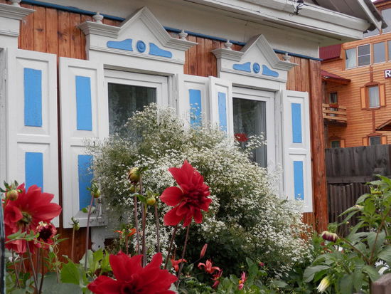 Wir fahren mit dem Bus in die Stadt und irgendwie sind wir begeistert, sie hat einen besonderen Flair. Wunderschoen an der "Angara" gelegen, mit vielen Parks und Gruenflaechen, die mit Blumen uebersaet sind. Zwischen moderner und alter Architektur fallen vor allem die Blockhaeuser auf, mit ihren unterschiedlich geschnitzten Fenstern.