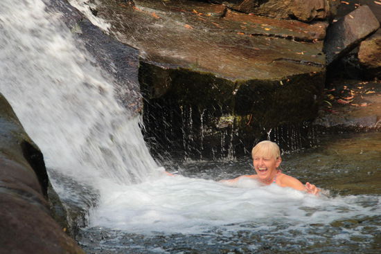 Nach nochmals 2 Stunden Weg, bei dem wir frisches Wasser aus Bambusrohren trinken und diese dann anschließend als Didgeridoo verwenden, kommen wir am Wasserfall an. Dieser ist nicht ganz so groß wie der gestrige, dafür tief und so springen wir hinein in die Fluten und haben einen Mordsspaß.