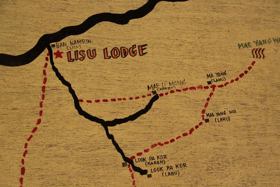 Nachdem die Sonne schon untergegangen ist, finden wir ihn in einem Bergdorf. Wie eine kleine Familie sitzen die Gäste am großen Tisch bei Rudi in der "Lisu- Lodge" und wir bekommen sofort noch ein leckeres Essen serviert.