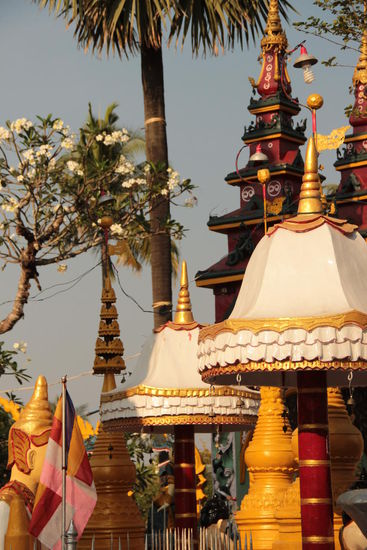 Unser Weg führt uns zur "Botahtaung- Pagode", unser letztes Ziel für heute. Oh, dieses heilige Gemäuer sind noch viel prunkvoller gestaltet, als die vorherige Pagode. Außerdem wird hier alles bunt geschmückt und mit Teppichen ausgelegt, leider haben wir den Grund der Vorbereitungen nicht erfahren.