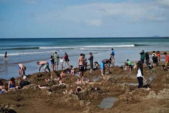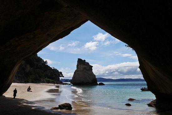 Von Coromandel ging's dann weiter nach Whitianga, wo sich der Hot Water Beach und die Cathedral Cove befindet. Am Heisswasserstrand kann man ein Loch buddeln und es kommt dann heiss bis sehr heisses Wasser raus, ganz im Stile von Thermalquellen. Eigentlich ein sehr witziges Phänomen, aber doch zu kalt und sandig für uns. Aber diese Umstände hielten nicht alle vom Badespass ab. Bei der Cathedral Cove machten wir einen Spaziergang zu den aussergewöhnlichen Felsformationen. Für mich fühlt es sich nach wie vor ganz komisch an, an den Stränden mit Schuhen, langen Hosen und Jacke rumzulaufen. Aber ja es ist halt noch nicht Sommer.