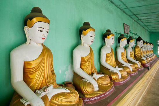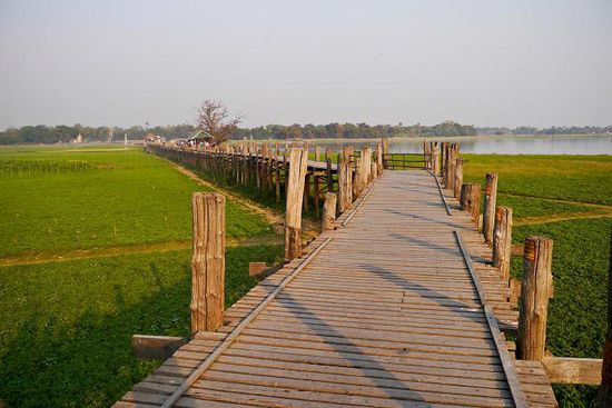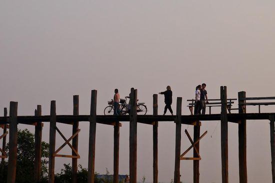 In Amarapura steht die 1850 errichtete Holzbrücke mit einer Länge von 1,2 KM. Dadurch ist sie die längste Brücke der Welt. Und es geht auch sehr geschäftig zu und her. Nur ist die Frage ob Touristen oder Einheimische für den vielen Verkehr verantwortlich sind... Tempel, Stupas und Höhlen sowie Hunderte von Klöstern und Meditationszentren prägen die Hügelketten von Sagaing am westlichen Ufer des Ayeyarwady. Als wir mit den Rollern die Brücke überquerten und das Ausmass dieser Landschaft sahen waren wir echt beeindruckt. Hier in Sagaing ist wohl das Mekka der Buddhistischen Kultur Myanmars. Hier sollen gegen 5000 Mönche und 3000 Nonnen leben.