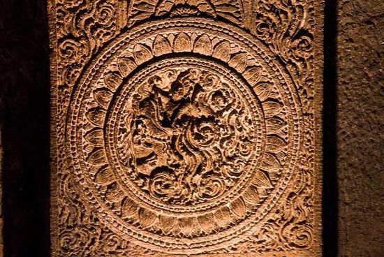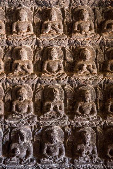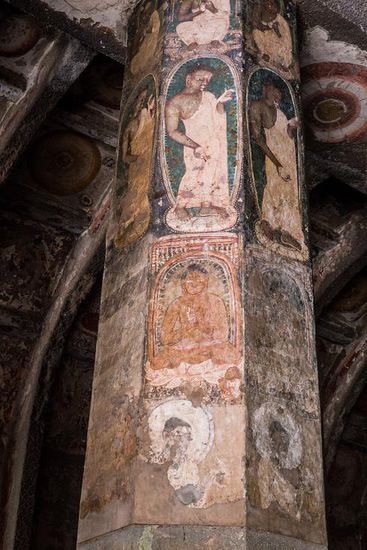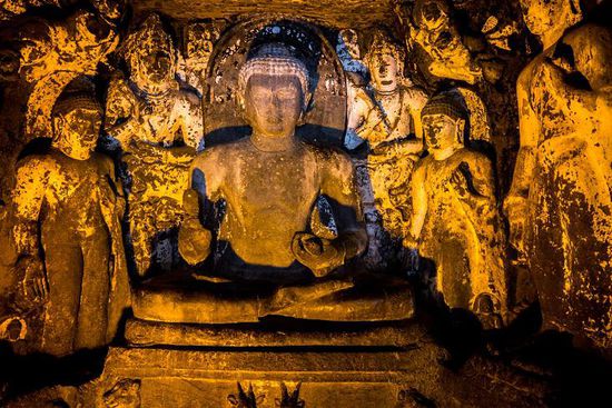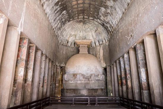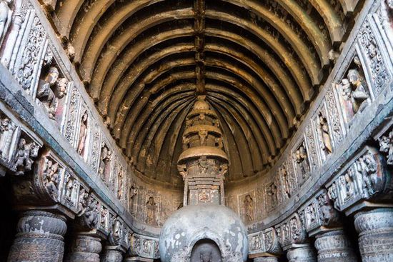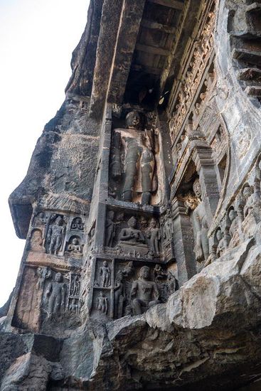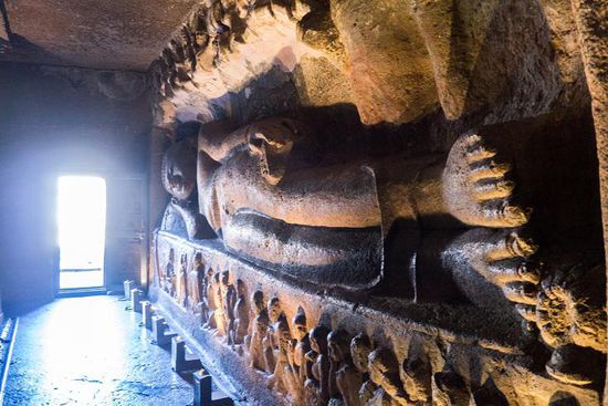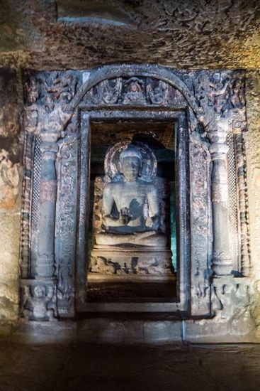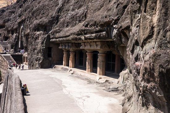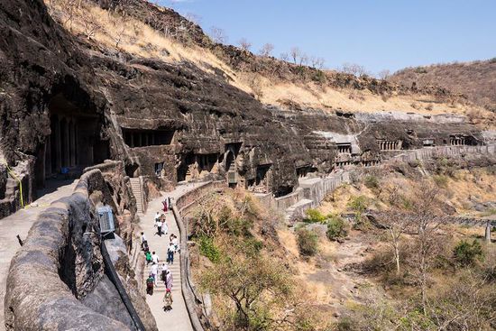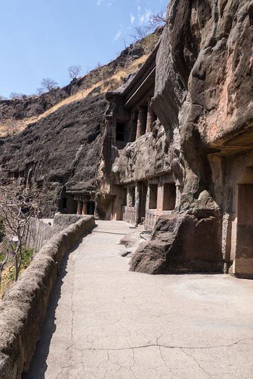 Die Ajanta-Höhlen liegen in der Nähe der Stadt Ajanta, im Nordosten des indischen Bundesstaates Maharashtra, ca. 100 km nördlich der Stadt Aurangabad. In einem steil durch den Fluss in den Fels eingeschnittenen, U-förmigen Tal findet man zahlreiche in den Fels getriebene, große Höhlentempel.