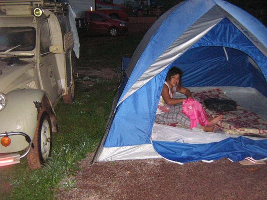 Wo gibts hier ne Unterkunft? fragen wir den Kantinero. Er geht mit mir hinters Haus und zeigt mir ein Iglu-Zelt mit zwei Matratzen drin, welches er uns gerne fuer 20 Real die Nacht vermieten würde. Wir schlagen zu, mangels Lust am Bettenbau in der "Gordita". Außerdem ist was Essbares und ein frisches Bier erst mal wichtiger.