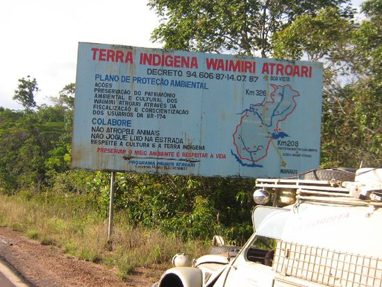 Noch am gleichen Tag durchfahren wir auf der BR 174 das Indianerschutzgebiet Waimiri Atroari, wo man die Durchfahrterlaubnis nur von 6 bis 18 Uhr erhält. Nachts sind die Schranken geschlossen. Es ist verboten anzuhalten, zu fotografieren und zu filmen. Parkwaechter hatten uns praktisch auf der ganzen Strecke mehr oder weniger im Auge, damit das auch eingehalten wird. Man gibt vor, das die Waimiri gefährlich sind. Ich denke aber, dass man sie einfach vor der sogenannten Zivilisation schützen will. Ich will mich dann später besser informieren, was es da wirklich auf sich hat. Wir durchfahren dieses Gebiet und kommen dann kurz vorm dunkel werden auf der anderen Seite raus, wo exakt die Äquatorlinie verläuft. Da gibts ne Tankstelle und ein kleines Fernfahrer-Restaurant.