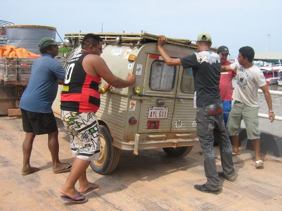 Kurzerhand bauen wir auch noch Motor und Getriebe aus und verzurren den vorderen Rahmenteil auf der Quertraverse des LKW's. Alles Gepäck kommt auf die Ladefläche inkl. wir beide. Bei einigen Rueckfahraktionen im Schlamm leidet auch noch mein Rahmen ganz fürchterlich. So im Schlepp treffen wir dann nach zweieinhalb Tagen in Manaus ein. Richtige Supertypen, die beiden Brasilianer Gerardo und Meico. In den schwierigsten Situationen wird erst mal die Samba auf volle Lautstärke gedreht, und dann geht's los, mit Auto ausgraben und so. Kein schimpfen und nörgeln war von den beiden zu hören.