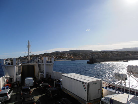In der Nacht von gestern auf heute ist das Wetter wohl kräftig umgeschlagen. Um 8:30h war es recht kühl, aber die Luft war wohl durch das nächtlichen Gewitter gereinigt und klarer geworden. Um 9:10h ging meine Fähre von Messina zurück auf's Festland. An diesem Morgen wurden wir auf dem Deck für Eisenbahnwaggons untergebracht. Drei Tracks in eine Richtung, und du musst über diese Gleise mit Gepäck und regennass jonglieren. Ich verstehe sowieso nicht, warum man bei einem solchen Verkehrsaufkommen noch keine Brücke die paar Meter gebaut hat.