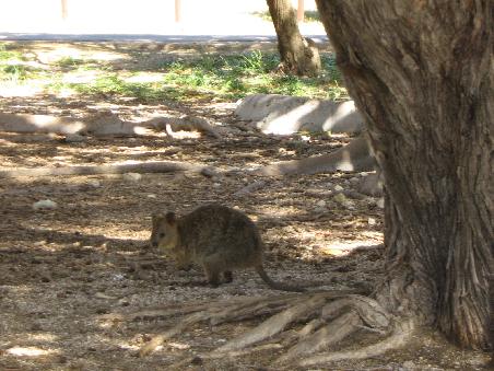 Das ist ein Quokka. Diese kleinen suessen Dinger leben angaeblich nur auf Rottnest Island. Daher kommt der Name der Insel, da man die Quokkas frueher fuer Ratten gehalten hat (Rottnest Island = Rattennest).