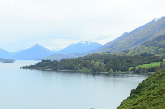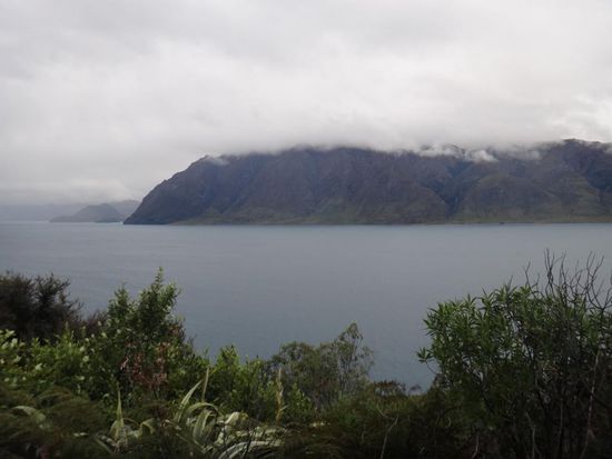Am nächsten Tag ging es dann weiter Richtung Wanaka. Neuseeland ist zwar nicht extrem groß, aber die Straßen sind meistens eng und kurvig, so dass man nicht besonders schnell fahren kann. Insbesondere wenn man ein langsames Auto oder einen LKW vor sich hat, kann es durchaus vorkommen, dass man bis zur nächsten zweispurigen Stelle nur 60 km/h fahren kann. Dadurch dauert eine Strecke von 200 Kilometern meistens 2,5-3 Stunden. Das ist aber nicht weiter schlimm, da man meistens durch wunderschöne Landschaften fährt und es regelmäßig Aussichtspunkte gibt oder Parkplätze, von denen man kleine Spaziergänge zu Wasserfällen, zum Strand oder ähnlichem machen kann. Auch sieht man des Öfteren Fahrradfahrer - wäre mir zu anstrengend, da es hier ständig hoch und runter geht, aber Neuseeland scheint für Fahrradtouristen ein beliebtes Ziel zu sein. Die Strecke nach Wanaka führte erst am Meer entlang und anschließend vorbei an einigen schönen Seen, die leider aufgrund des Regens nur halb so schön aussahen wie auf den Postkarten.
