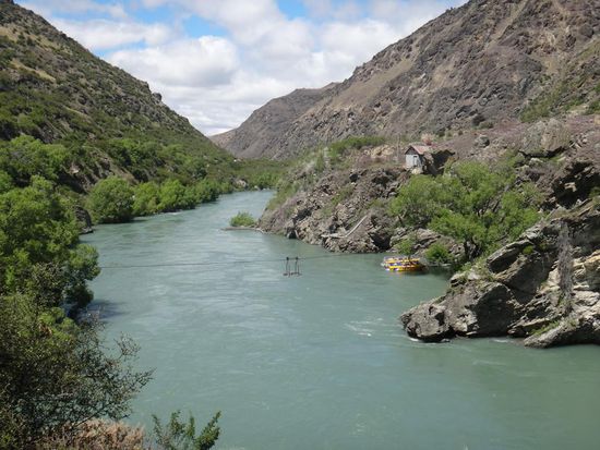 Wanaka liegt am Lake Wanaka und ist ein hübscher kleiner Ort, in dessen Umgebung man jede Menge Outdoor-Sportarten wie Rafting praktizieren kann. Ich wollte mir diese Aktivitäten für Queenstown aufheben - DEM Outdoor-Paradies der Südinsel - und habe deshalb nur einen halben Tag und eine Nacht in Wanaka verbracht. Ursprünglich wollte ich eine Wanderung im Mount Aspiring Nationalpark unternehmen, doch leider war die Straße dorthin nur mit Allradantrieb befahrbar. In Queenstown angekommen, habe ich erstmal den Ort besichtigt (damit ist man nach einer halben Stunde langsamen Gehens fertig) und habe dann für die nächsten beiden Tage Rafting und Canyoning gebucht. Beim Rafting fährt man auf einem Schlauchboot einen Fluss herunter, der zwischendurch Stromschnellen verschiedener Länge und Schwierigkeit zu bieten hat (in Englisch rafts, daher der Name), während Canyoning eine Mischung aus Abseiling (an einem Seil Felsen hinunter klettern), Wasserfälle hinunterspringen oder -rutschen und in meinem Fall Ziplining (an einem Drahtseil über eine Schlucht oder ähnliches sausen) ist. All das findet in einem Canyon, also einer Schlucht statt, die im Optimalfall verschieden hohe Wasserfälle, Klettersteige und dergleichen bietet. Selbstverständlich hat man bei beiden Aktivitäten fachkundige Guides dabei und bekommt Ausrüstung und Schwimmfesten gestellt.