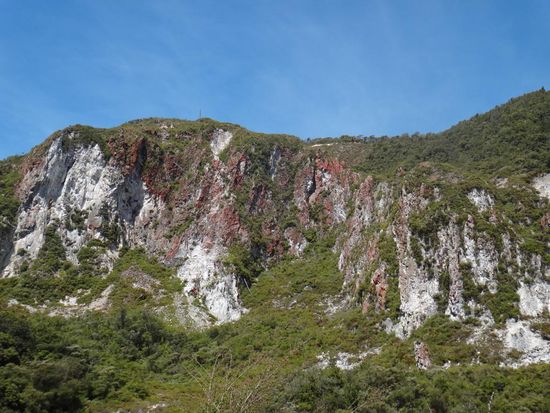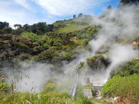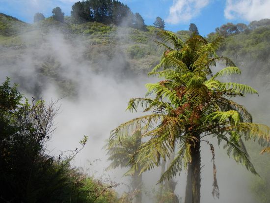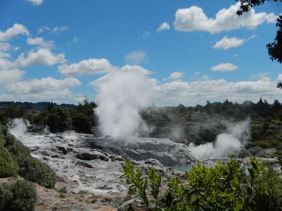 Inzwischen waren wir im vulkanischen Teil Neuseelands angekommen. Bereits auf der Fahrt nach Taupo bin ich auf der Desert Road (die ihren Namen übrigens verdient hat) durch den Tongariro Nationalpark gefahren. Dabei konnte ich bereits die schneebedeckten Gipfel der Vulkane sehen. Eigentlich hatten wir geplant, von Taupo aus das Tongariro Crossing, eine der besten Eintageswanderungen weltweit, zu machen. Leider war ein paar Tage vorher einer der Vulkane ausgebrochen, so dass die gesamte Wanderung aus Sicherheitsgründen geschlossen war. Deshalb haben wir uns dazu entschieden, bereits früher als geplant nach Rotorua zu fahren und abzuwarten, ob die Wanderung innerhalb der nächsten paar Tage wieder geöffnet werden sollte. Die Straße von Taupo nach Rotorua heißt "Thermal Highway" und führt durch geothermisches Gebiet: Es gibt viele Thermalquellen und vulkanische Areale. In Rotorua riecht es außerdem dank des Schwefels häufig nach verfaulten Eiern.