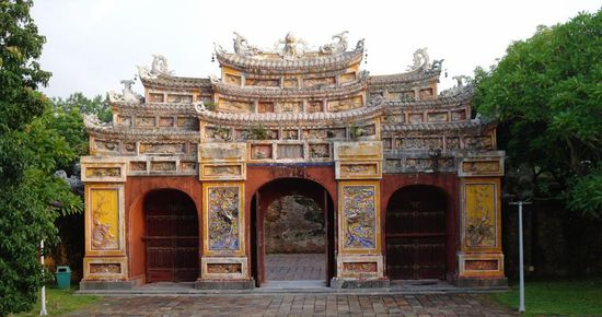 Am Morgen in Hue angekommen wurden wir von unserem ersten richtigen Regenschauer überrascht, der aber nach max. einer Stunde auch schon wieder vorbei war. Wenn es im Vietnam regnet, dann zwar richtig stark, aber nie lange. Wir haben uns, wie in Hanoi, im Backpackers Hostel eingemietet und uns gleich für einen Stadtspaziergang aufgemacht. Wenn man aus Hanoi kommt, ist Hue eine sehr angenehm ruhige Stadt, ohne viel Verkehr und wunderschön am Parfümfluss gelegen. Viele Sehenswürdigkeiten befinden sich innerhalb der 2 m dicken und 10 km langen Mauern der Zitadelle (UNESCO-Welterbstätte), das ehemalige Machtzentrum der Stadt. Auch heute noch kann man die Pracht des kaiserlichen Vietnams spüren, obwohl viele der Bauwerke durch den Krieg zerstört wurden (20 der 148 Bauwerke sind noch erhalten). Es lohnt sich auf jeden Fall hier einen kurzen Stop auf der Durchreise einzulegen.