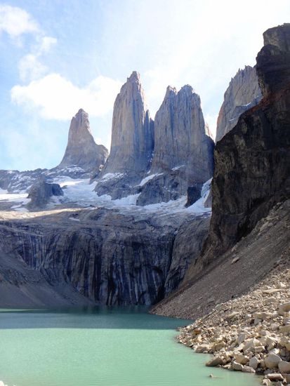 Als nächstes ging es wieder zurück nach Chile, genauer nach Puerto Natales. Dort blieb ich allerdings nur eine Nacht, den am nächsten Tag startete meine viertägige Wanderung durch den Torres del Paine Nationalpark. Zwei Wanderrouten sind besonders beliebt: Das sogennante "W" und das "O". Ich habe mich aus Zeitgründen für das "W" entschieden - es ist gut in vier Tagen machbar, während das "O" mindestens eine Woche dauert und auch deutlich anspruchsvoller ist. Man kann entweder auf den verschiedenen (teils kostenlosen) Campingplätzen zelten oder in Hütten (sog. Refugios) übernachten. Die muss man allerdings im Voraus buchen und sie sind ziemlich teuer. Da ich bereits Zelt und Schlafsack hatte, musste ich mir nur noch Geschirr, Kochtopf und Isomatte ausleihen, Essen für die nächsten vier Tage einkaufen und mein Busticket zum Park buchen. Am nächsten Tag ging es früh morgens los. Ich wollte von Westen nach Osten laufen, da mir das von mehreren empfohlen wurde. Leider stürmte es aber so stark, dass die Fähre nicht ablegen konnte. So verbrachte ich die erste Nacht gemeinsam mit drei Chilenen in einem Container beim Fähranleger. Er ist eigentlich nicht öffentlich, aber der Besitzer des kleinen Cafés beim Fähranleger ließ uns netterweise dort übernachten (normalerweise nächtigen die Arbeiter dort). Da alle anderen entweder zum Parkeingang zurückgefahren waren oder auf einem Campingplatz in der Nähe schliefen, waren wir am nächsten Morgen die einzigen Personen auf der Fähre. Dafür warteten am anderen Ende 300 Leute!!
