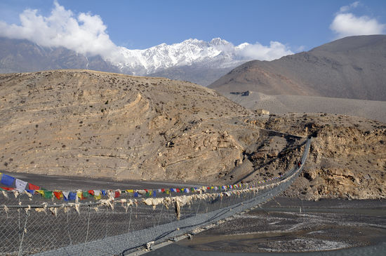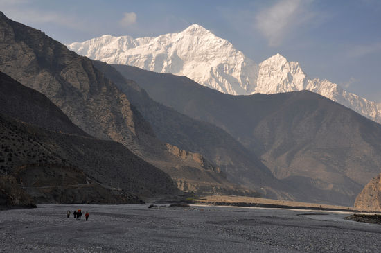 Heute liegt eine kurze Etappe entlang des Kali Gandaki nach Jomosom (2800m) vor uns. Der Nilgiri erstrahlt in der Morgensonne. Wir überholen eine Ziegenherde mit ihrem Hirten